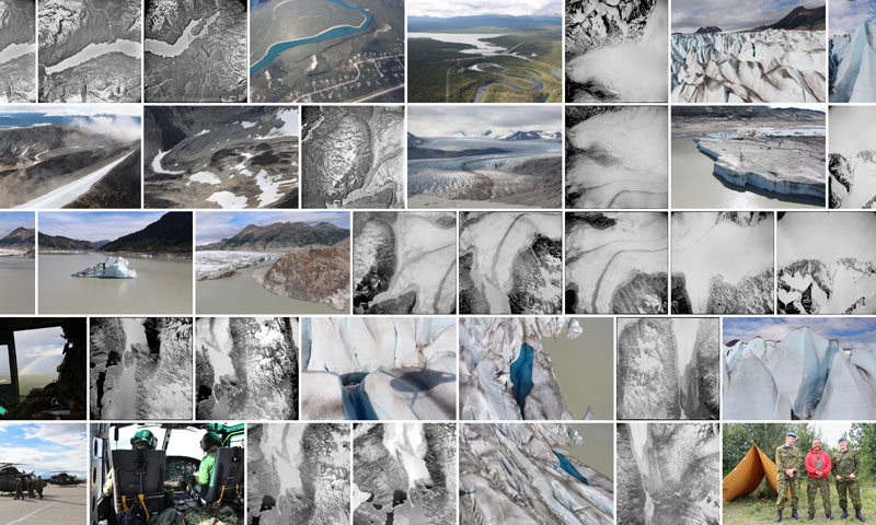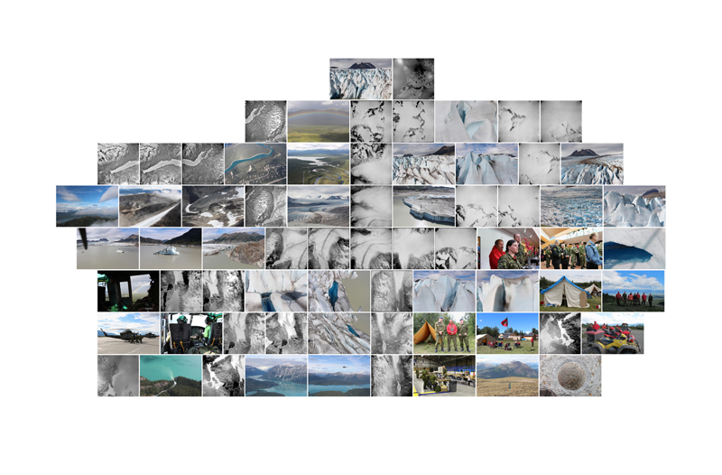 Kaskawulsh: Mosaic, 2016. 65in x 140in. 9in x 9in photographs, National Air Photo Library; 9in x 13.5in photographs, Leslie Reid