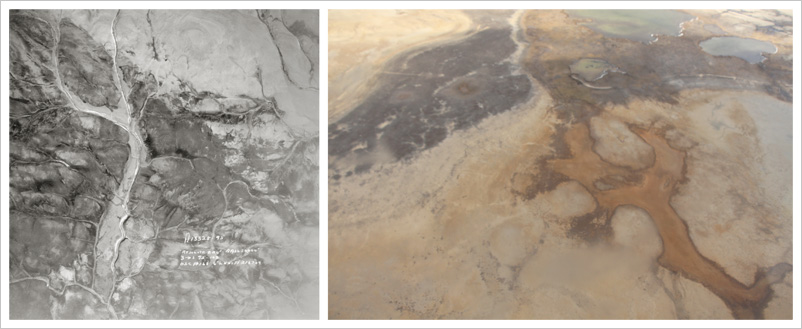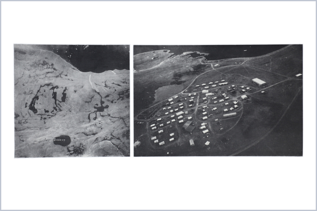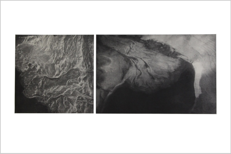The Resolute Series is comprised of photographic diptychs on paper: a set of 3 photoetchings, 2016-2017, and a set of 3 inkjet prints, 2016. All left hand images in each diptych are sourced from archival images at the National Air Photo Library, taken by the RCAF for mapping the North from 1948 to 1959. All right hand images were taken over Cornwallis Island by Leslie Reid while flying with the Canadian Forces Artist Program in 2013. In the 3 photoetchings, the right hand images show in sequence: a small herd of muskoxen huddling due to the sound of the helicopter overhead; the shore of Resolute Bay on the Northwest Passage; the Inuit hamlet of Resolute, established by the High Arctic Relocation of 1953-55 (second location). The airport, weather station and Polar Continental Shelf Program facilities are a few kilometres away from the hamlet. The photoetchings were produced at Open Studio, Toronto, through the RCA/Open Studio Print Fellowship. The set of inkjet prints were produced by Roxanne Lafleur.